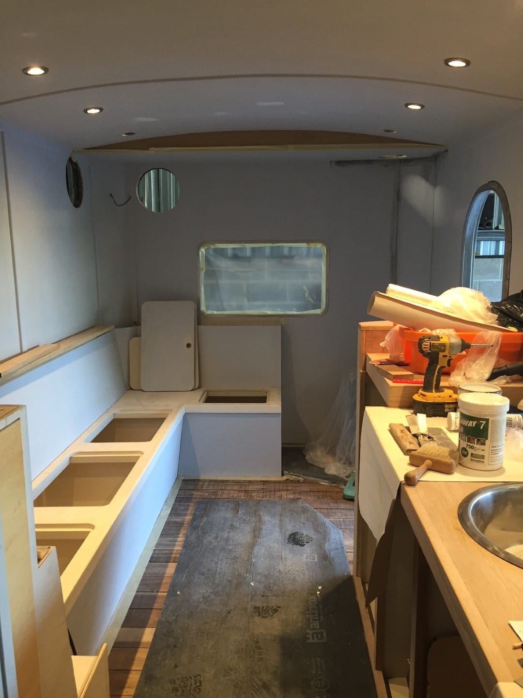A clever, and compact kitchen runs the right-hand length of the caravan. It has an oven, hob, sink with fresh running water and ample work surfaces, made from flooring from our house renovation – ever the upcyclers!